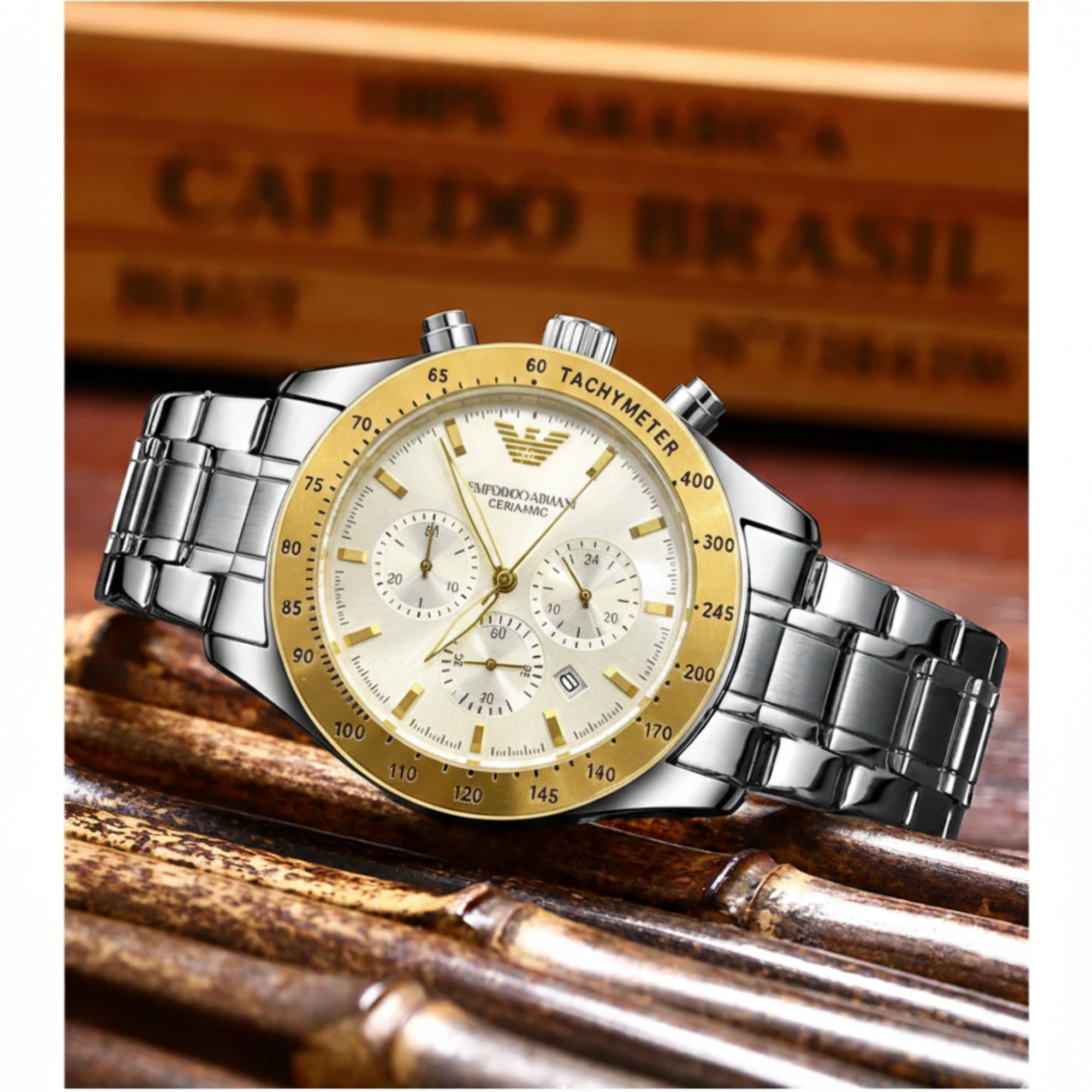 Emporio Armani World Explorer Men’s Watch – 43.5mm chronograph with two-tone stainless steel bracelet, eggshell dial, gold accents, 10 ATM water resistance, and Certilogo authentication.